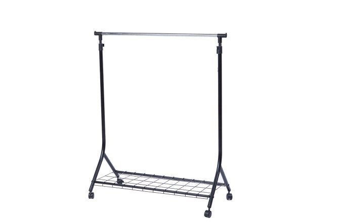 A metal collapsible hanger from the Titan collection is useful in the dressing room for placing and storing seasonal items. It can also be used as a temporary option if a large number of guests arrive. When folded, the product takes up little space, it is easy to assemble and disassemble, and does not require special tools. You can adjust its height using locking screws. The bottom shelf is convenient for storing shoe boxes. The hanger is equipped with wheels, making it easy to move from place to place.