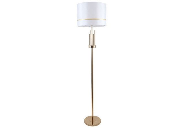 The STILFORT Chart floor lamp will be an effective complement to other lamps from the collection of the same name and will create a cozy illumination of the relaxation area. The base of the model is made of metal with a golden galvanic coating. The upper part of the support is decorated with a block with thin metal rods of different heights and a round rosette made of transparent glass. A white textile cylindrical lampshade, decorated with golden edging, gently diffuses the rays of the lamp. All design elements are ideally combined with each other, forming an effective and stylish composition.