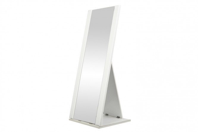 A high floor mirror with a bevel around the perimeter is an original interior detail, an element of the Victoria modular bedroom. The reflective sheet is supported by a wide stand mounted on a stable support; The tilt angle is adjustable. The frame is made of laminated chipboard in a “white snow” decor with barely noticeable pores, which creates the effect of a woody rough structure. The facade is made of 16 mm MDF covered with glossy PVC film and decorated with milling. On the reverse side there is an elegant coat hook. The model is universal, it can be used in any interior.
