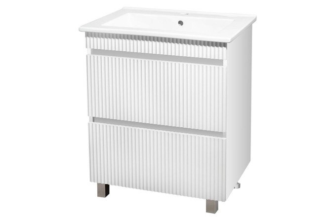 Bathroom vanity cabinet RUNO MODENA (floor-standing) is sophistication and sophisticated luxury in the interior. Wavy corrugated facades visually enliven the entire decor of the room, while maintaining peace and tranquility. Pairs perfectly with the classic white body color. The color of the facade will fit perfectly into any bathroom interior. The sink is not included and must be purchased separately. The overhead ceramic washbasin “Oscar” (770/470/190 mm) matches the bathroom cabinet.