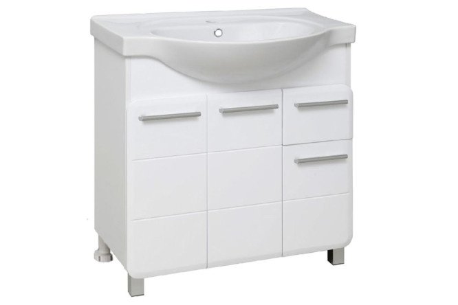 Sink cabinet RUNO ERIKA – modern and stylish design in bathroom design. The ERIKA washbasin cabinet (floor-standing), made in white with a glossy finish, inlaid with square milling on the facades, will perfectly decorate any bathroom interior. The bathroom cabinet has three hinged doors and a side drawer on ball guides (on the right). The cabinet comes with 4 handles, hinges with a built-in closer, 2 chrome-plated and 2 plastic legs. The sink is not included and must be purchased separately. The ceramic washbasin “ERICA” (800/510/240 mm) matches the bathroom cabinet.