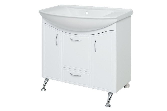 The RUNO SEVILLE vanity unit is an impeccable classic with a modern twist in bathroom design. Will fit harmoniously into any interior. The bathroom cabinet has two hinged doors, one hinged door and a lower drawer on ball guides. The cabinet comes with 4 handles, hinges with a built-in closer, 2 chrome-plated and 2 plastic legs. The sink is not included and must be purchased separately. The cabinet is matched with a ceramic sink “Style 85” (870/490/210 mm).