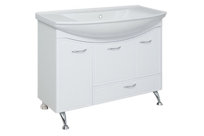 The RUNO SEVILLE vanity unit is an impeccable classic with a modern twist in bathroom design. Will fit harmoniously into any interior. The product has one hinged door, two folding doors and a lower drawer on ball guides. The left folding front is equipped with a built-in laundry basket. The set includes: 4 handles, hinges with built-in closer, 2 chrome and 2 plastic legs. The sink is not included and must be purchased separately. The “Style 105” sink (1055/500/210 mm) matches the bathroom cabinet.