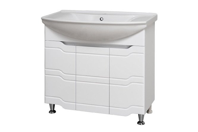 The RUNO STYLE sink cabinet is a stylish and fashionable solution for bathroom design. A floor stand with wavy milling along the facade will harmoniously fit into any interior. The bathroom cabinet has three hinged doors and three built-in shelves. The cabinet comes with hinges with a built-in closer, 2 chrome-plated and 2 plastic legs. The sink is not included and must be purchased separately. The “Style 85” washbasin (870/490/210 mm) matches the bathroom cabinet.