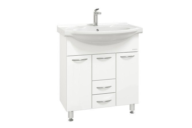 Onika Monika 75 is a simple floor-standing bathroom cabinet with extensive functionality. White glossy surface, simple narrow handles, lack of decor, laconic shape and minimalist design.