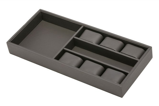 The DUSLAR FOUNDATION organizer is an excellent solution for storing watches and bracelets and provides compact and convenient storage of accessories. It combines practicality, convenience and time saving. The organizer has two special cells with rollers for storing watches and two universal cells that are ideal for bracelets, chains and other accessories. The eco-leather finish, pleasant to the touch, is not only durable, but also resistant to cracks and drying out. The organizer’s durable frame holds its shape well, which ensures a long service life. With this organizer you can create perfect order in your closet and ensure easy access to things every day. Watches, bracelets and chains will no longer get tangled or lost – each accessory has its own place, and it’s easy to find the right item among them. The ORGANIZER FOUNDATION line offers a variety of forms of organizers that will help you create the optimal combination for storing belts, ties, scarves, scarves, watches, rings, cufflinks and other small items. With the DUSLAR FOUNDATION organizer, accessories will always be at hand and ready for use.