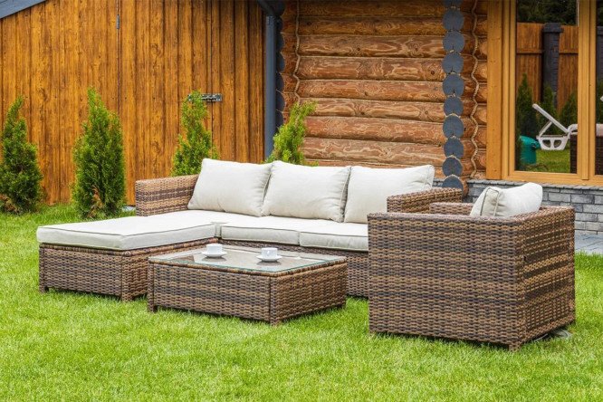 All items have a steel frame, decorated with artificial rattan, and the table top is covered with transparent glass. It is better to bring pillows with removable covers made of waterproof fabric into the house during bad weather.
