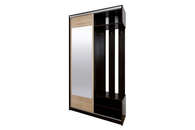 The combination of modern materials, high-quality fittings and fashionable colors make this furniture an excellent choice for a hallway decorated in any style. It has everything you need: hooks for clothes, a spacious compartment for storing things on hangers, sections for shoes and hats, as well as a large mirror that allows you to see yourself in full length.