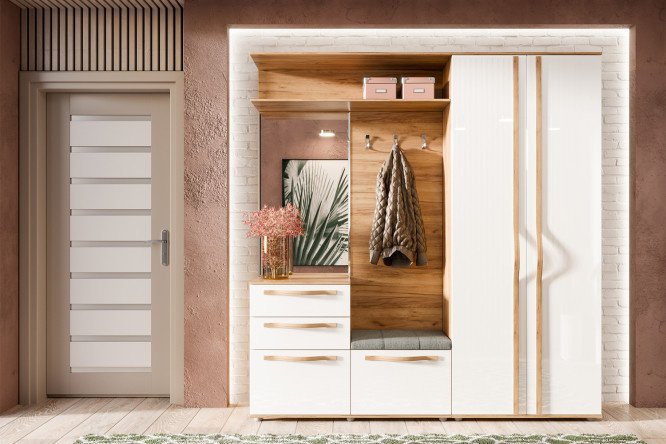 white gloss, golden oak, light gray