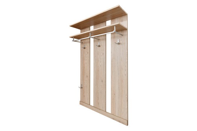 The wall hanger included in the Oskar furniture collection is a good way to organize the space of a small hallway. The product is made of high-quality laminated chipboard, the decor of the coating convincingly imitates the natural texture of oak wood. The panel, consisting of individual slats, is equipped with a shelf for hats and hooks for outerwear and bags. The holders are securely fastened and have a convenient bifurcated shape, which allows you to hang heavy winter clothes on them – coats, down jackets, fur coats.