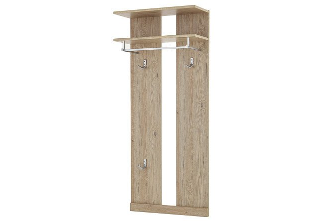 The wall hanger included in the Oskar furniture collection is a good way to organize the space of a small hallway. The product is made of high-quality laminated chipboard, the decor of the coating convincingly imitates the natural texture of oak wood. The panel, consisting of individual slats, is equipped with a shelf for hats and hooks for outerwear and bags. The holders are securely fastened and have a convenient bifurcated shape, which allows you to hang heavy winter clothes on them – coats, down jackets, fur coats.