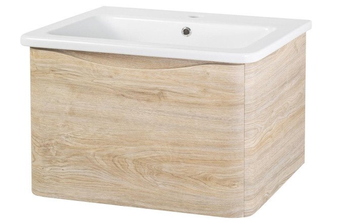 Bathroom vanity cabinet RUNO TUSCANA (wall-hung) – made in an ultra-modern design, the distinctive features of which are: rounded corners of the cabinet, wood texture of the facade in light wood color, mortise handle – giving the furniture an unusual and unforgettable appearance. The bathroom cabinet is equipped with a drawer on ball guides, with a soft closing system. The bathroom cabinet is matched with a counter-mounted ceramic washbasin Nixon 80 (800×460 mm) TM Dreja, the unusual design of which, a combination of strict rectangular lines with rounded corners, reflects modern design trends. Sink 16 cm deep. RUNO bathroom furniture – beauty and practicality in the details!