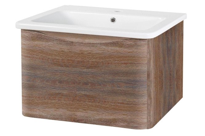 Bathroom vanity cabinet RUNO TUSCANA (wall-hung) – made in an ultra-modern design, the distinctive features of which are: rounded corners of the cabinet, wood texture of the facade in dark wood color, mortise handle – give the furniture an unusual and unforgettable appearance. The bathroom cabinet is equipped with a drawer on ball guides, with a soft closing system. The bathroom cabinet is matched with a counter-mounted ceramic washbasin Nixon 80 (800×460 mm) TM Dreja, the unusual design of which, a combination of strict rectangular lines with rounded corners, reflects modern design trends. Sink 16 cm deep. RUNO bathroom furniture – beauty and practicality in the details!