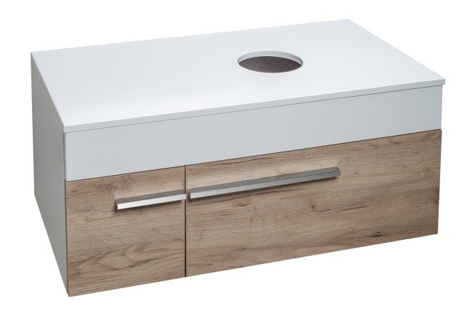 The hanging cabinet for the bathroom sink RUNO WOODLINE is made in an ultra-modern design in craft oak color. The cabinet is equipped with a drawer on ball guides and one hinged door. The product will harmoniously fit into any bathroom interior. The kit includes: 2 handles, hinges with built-in closers and canopies for mounting to the wall. Any countertop washbasins will fit into the bathroom cabinet. The sink is not included and must be purchased separately. When choosing a sink, please take into account the dimensions of the countertop of the cabinet.