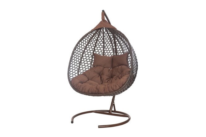 The Fiji two-seater cocoon chair, combining the functionality of garden furniture and a swing, will put an end to children’s disputes about who will swing first. The dimensions of the basket allow two adults to enjoy an evening relaxation in the garden or at home – you just have to remember the maximum permissible load is up to 140 kg. The stand and base are made of metal and powder coated. The cocoon is made of artificial rattan, resistant to moisture and UV radiation. The model is equipped with soft elements made of fabric with a water-repellent effect: one large and two small pillows are attached to the frame using ties.
