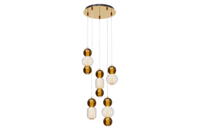 Drop-shaped lampshades emit intense light and create a waterfall of colorful reflections.