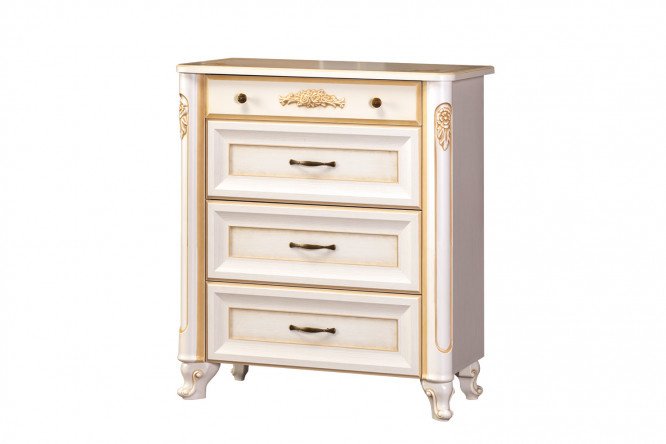 Ellie’s nightstand will appeal to lovers of the classics and will be a wonderful addition to the furnishings of a girl’s room. The cabinet on high, gracefully curved legs is equipped with four spacious drawers, which, thanks to full-extension ball guides, move easily and silently. You can neatly arrange linen, accessories and various small items in them. On the front of the top drawer with button handles and on the rounded corner elements there are golden decorations in a floral style, the other three drawers are made with frame fronts and handles in the form of brackets in the color of aged bronze. They are covered with a golden patina and look impressive against the background of white and cream facades.