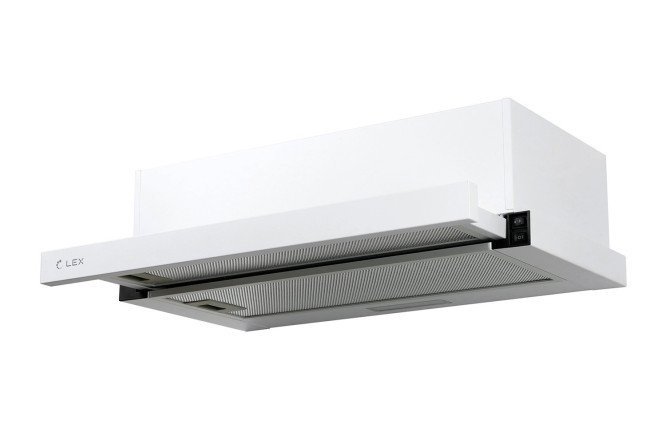 The LEX HUBBLE built-in hood will effectively remove cooking odors and protect walls and furniture from soot and greasy deposits. The telescopic model with a durable steel body operates in air exhaust or air recirculation mode. Keys for selecting one of two ventilation speeds, controlling LED backlighting, and turning the device on and off are easily accessible. To quickly start operating the LEX HUBBLE hood, simply pull forward the frame with the aluminum mesh filter.