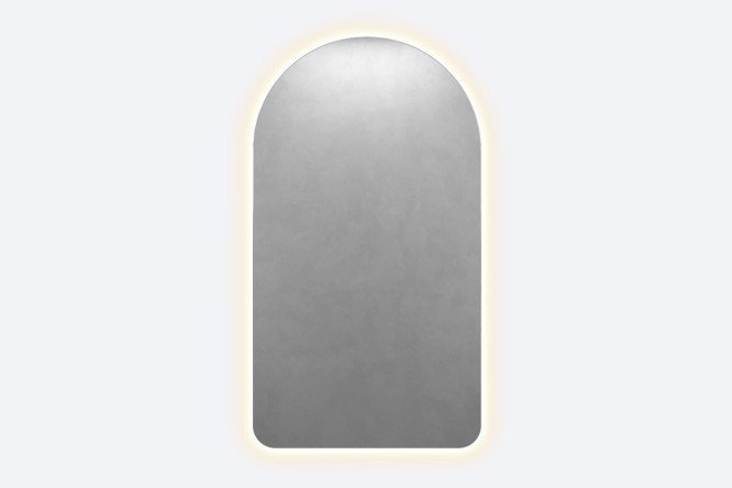 Frameless arched mirror with contour (back) warm lighting, light 3000K. The substrate is made of high-quality MDF, the LED strip is protected by a matte light diffuser from dust and moisture. There is a 220W output for connecting to the network (12V backlight power supply), turning on the backlight from a switch on the wall or from an outlet.