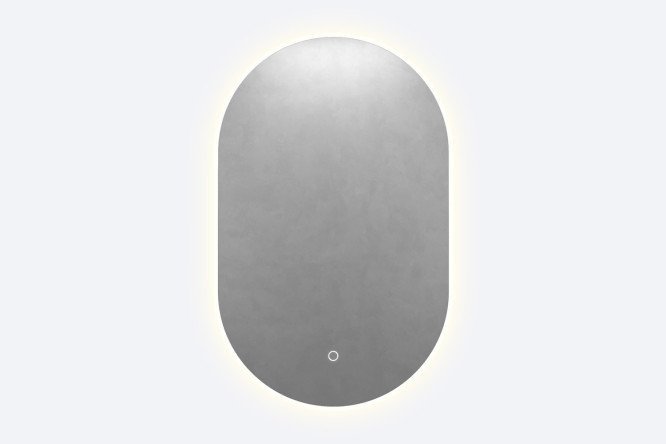 Frameless oval (capsule) shaped mirror with contour (back) neutral lighting, light 4000K. The substrate is made of high-quality MDF, the LED strip is protected by a matte light diffuser from dust and moisture. There is a 220W output for connecting to the network (12V backlight power supply), turning on the backlight from the touch button on the mirror.
