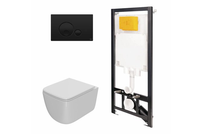 Rimless, wall-hung toilet with an ultra-thin, antibacterial seat with soft closing and an easy-to-remove mechanism, chrome-colored hinges, OLI 180 ECO installation and OLI water flush key included.