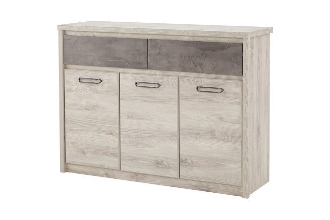 The spacious Jazz cabinet is one of the elements of the collection of living room furniture of the same name. The model is made of high quality laminated chipboard, the ends are finished with a 0.5 mm PVC protective edge. The harmonious combination of expressive Nairobi Chestnut wood decor and natural onyx texture inserts looks stylish and elegant. Neutral gray tones can be successfully combined with almost all colors – both delicate pastels and bright, saturated ones. This opens up opportunities for the most daring experiments with interior design. The fronts are complemented by elegant Boyard metal handles with a decorative finish to resemble brushed antique tin.