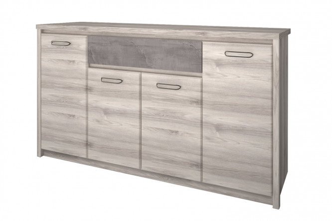 The spacious Jazz cabinet is one of the elements of the collection of living room furniture of the same name. The model is made of high quality laminated chipboard, the ends are finished with a 0.5 mm PVC protective edge. The harmonious combination of expressive Nairobi Chestnut wood decor and natural onyx texture inserts looks stylish and elegant. Neutral gray tones can be successfully combined with almost all colors – both delicate pastels and bright, saturated ones. This opens up opportunities for the most daring experiments with interior design. The fronts are complemented by elegant Boyard metal handles with a decorative finish to resemble brushed antique tin.