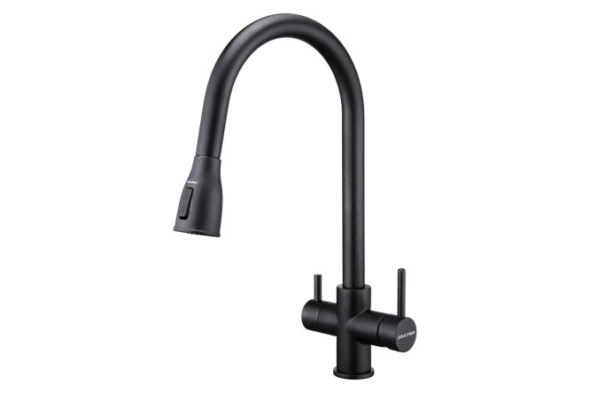 PAULMARK Lange is an impressive, practical and technologically advanced kitchen faucet that will decorate your interior. The model with a pull-out spout has a connection to a clean water filter: there is an elegant side switch to control its flow. Unfiltered water is controlled by a smooth-moving lever located on the right.