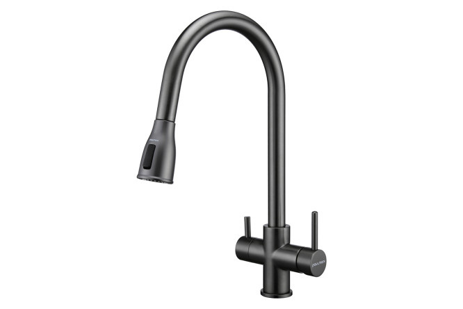 PAULMARK Lange is an impressive, practical and technologically advanced kitchen faucet that will decorate your interior. The model with a pull-out spout has a connection to a clean water filter: there is an elegant side switch to control its flow. Unfiltered water is controlled by a smooth-moving lever located on the right.