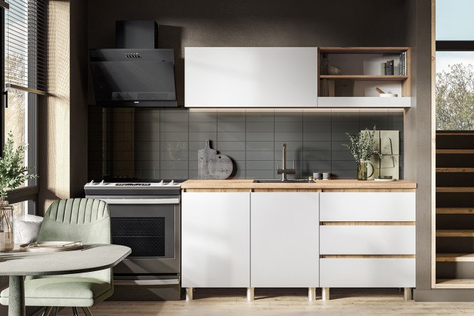 Consists of: – open wall cabinet 70 cm – single-door wall cabinet 100 cm – floor cabinet with 3 drawers 70 cm – two-door floor cabinet for sink, 100 cm – table top