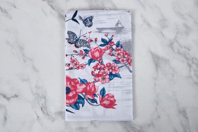 A soft and cozy Sakura kitchen towel measuring 45×70 cm is not only a reliable helper in the kitchen, but also its decoration. A towel with an elegant and light “Japanese” print in the form of flowering branches bending over a river will add mood to both you and the kitchen. The matting-type fabric is made of natural, hypoallergenic cotton. The material is durable, absorbs moisture well, is easy to wash, withstands bleaching, and dries quickly. The edges of the towel are sealed – no sloppy fringe will appear on them even after frequent washing and the most intensive use.