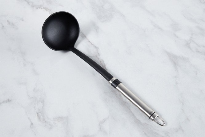 The kitchen ladle has a modern, dynamic design that combines stainless steel and high-quality plastic in an original way. The comfortable handle allows you to hold the item securely in your hand, and the ladle cup is located slightly at an angle, which provides additional convenience when scooping and pouring liquids. Thanks to a convenient loop, the ladle can be hung on a hook. Easy to clean, the metal retains a matte shine – a durable model will last for years.