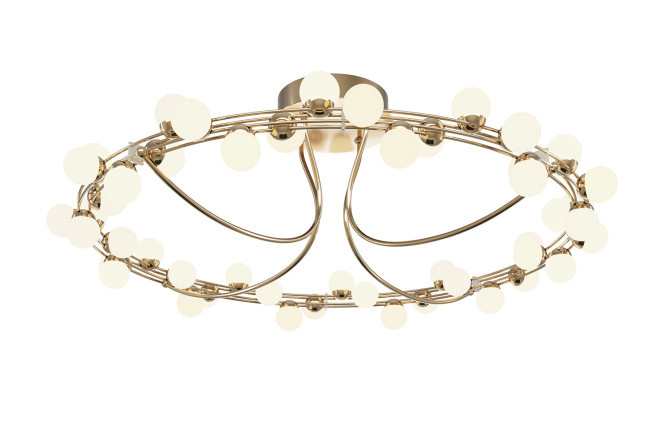 A wide circle framed by “molecules” of light provides the most uniform and bright illumination of the space. “Atomic” or “molecular” design does not lose its relevance and allows you to advantageously place accents in the interior. One of the characteristic features of such lamps is their weightless design.