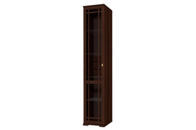 The display cabinet for dishes is included in the Sherlock living room set, in fact, being its elegant finishing touch. Designed in the strict classical style inherent in the entire collection, the model is equipped with glass shelves on which both dishes and decorative items look advantageous. The tinted glass door prevents dust from entering and provides an open view of objects. Along the facade it is decorated with binding, which increases the strength of the glass and creates visual unity of the cabinet with the other modules.