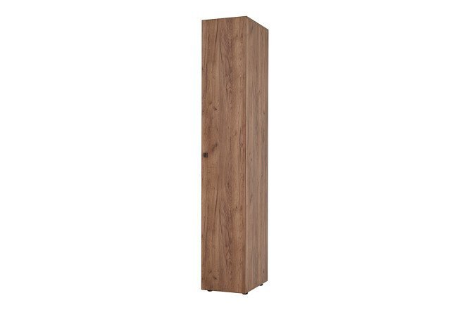 A distinctive feature of the Neo linen closet is its compactness. Behind the facade, which is only 40 cm wide, not only bedding sets, but also bedspreads, blankets, and home clothes can be perfectly placed. Four adjustable shelves divide the interior space into five spacious compartments. The minimalist design is based on clear rectangular shapes and a chipboard pattern that imitates oak wood in a beautiful tobacco color. The height/depth of the pencil case is identical to other cabinets in the Neo line and can be combined with them into a furniture set that takes up little space but is very spacious.