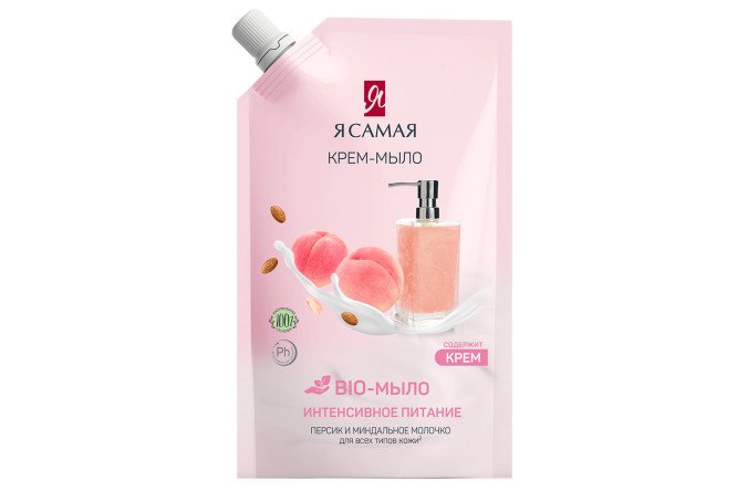 Liquid cream soap Intensive nutrition Bio, volume 0.5 l, aroma “Peach and almond milk”.