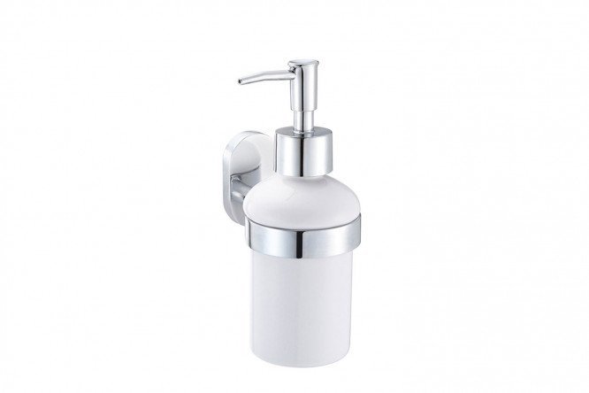 Brass wall-mounted liquid soap dispenser made of ceramic material, metal in chrome color.