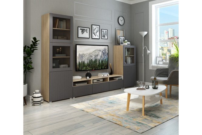 Living room Oscar Amelie with cabinet and wardrobe with push-to-open, sonoma oak/graphite wave