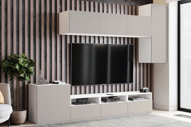 Living room Oscar Moon with 5 doors and 3 drawers with push-to-open, white / light gray soft