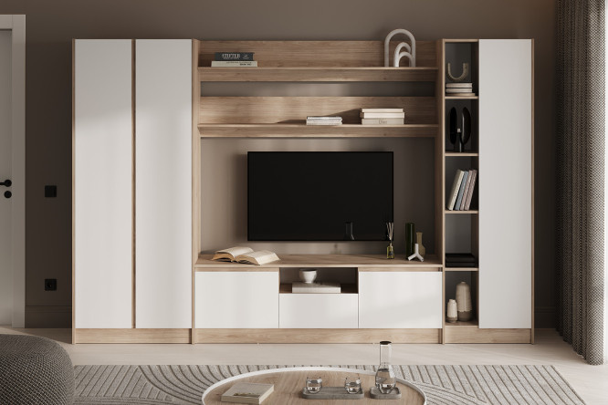 The Loreto wall is a stylish and spacious set of modular furniture that will allow you to beautifully furnish a living room or relaxation area in any other room. Using the kit’s products, you can assemble a single composition or place modules in different places in the room, which is very convenient for complex room layouts.