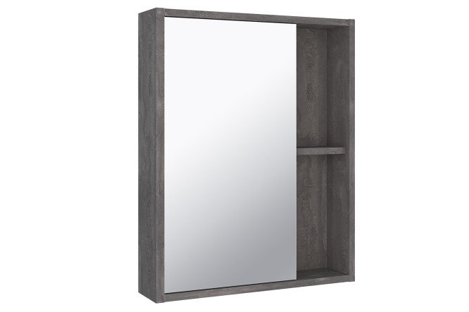 Mirrored bathroom cabinet RUNO ECO is an excellent solution for modern bathroom furnishings. ECO bathroom mirror is a stylish combination of gray-brown raw stone texture on an MDF body. The bathroom cabinet has one hinged door with a mirrored front and two open shelves; inside the cabinet there is one internal shelf.
