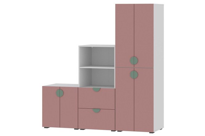 The facades do not have drilling for a certain size and type of handles. You can choose from different handle options for them. Additionally, you can purchase high legs: different leg options to choose from.