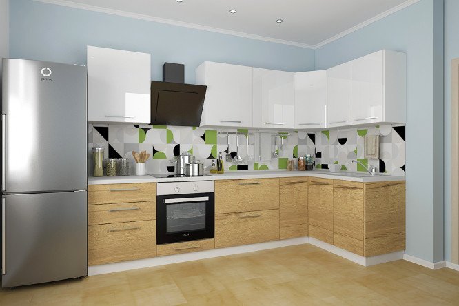 The Amika modular kitchen attracts with its wide palette of laminated chipboard facades with a varnish coating. Among the monochrome solutions: white, vanilla, truffle, graphite, gray mother-of-pearl, Halifax oak, stone. These same colors are presented in various combinations – mother-of-pearl with black, white with wood decor, brown with a hint of gray river pebbles.