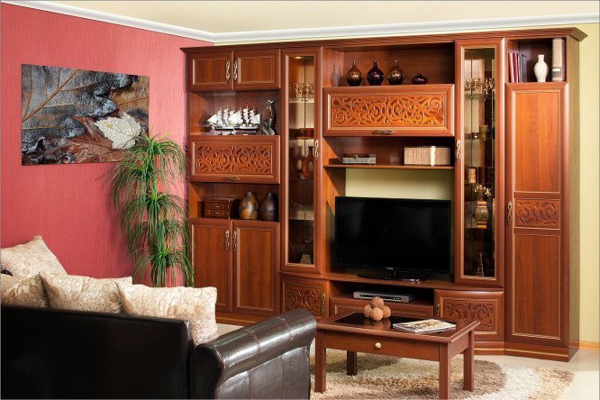 The Alexandria living room set will help you create an elegant and airy interior in a neoclassical style. Classic furniture design elements – framed facades, openwork milling – are complemented by radius facades. Two wardrobe options: 1-door with shelves and 2-door with a rod allow you to rationally use the living room space. Exquisite, functional shelving with spacious niches will be an excellent solution for decorating your living room interior. An original, spacious TV stand will harmoniously fit into the overall design concept in a neoclassical style. High-quality and reliable fittings – soft-closing door hinges, ball guides and gas lifts – ensure the comfort and functionality of each element. All elements of this series are assembled on the right and left sides.