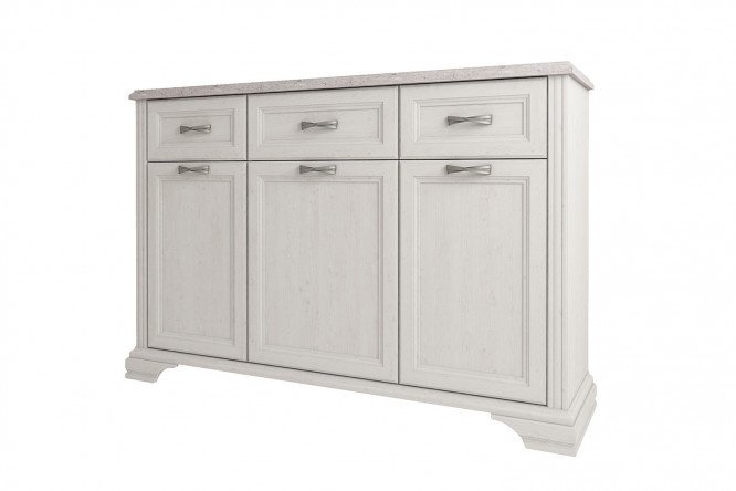 The Monako cabinet will help you solve the problem: how to ensure that every thing has its own place – and everything is at hand. The module will be used in the living room, bedroom, home office: it is convenient to store table or bed linen, dishes, books. The internal filling is represented by full extension drawers and sections with hinged doors, each of which contains one shelf. The thickened tabletop can serve as a TV stand. The design uses elements of the neoclassical style: paneled facades, decorative pilasters, accentuated by patina.
