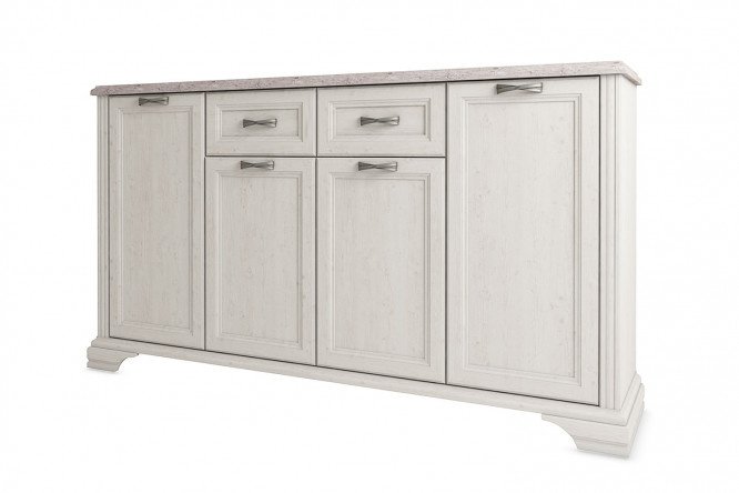 The Monako cabinet will help you solve the problem: how to ensure that every thing has its own place – and everything is at hand. The module will be used in the living room, bedroom, home office: it is convenient to store table or bed linen, dishes, books. The internal filling is represented by full extension drawers and sections with hinged doors, each of which contains one shelf. The thickened tabletop can serve as a TV stand. The design uses elements of the neoclassical style: paneled facades, decorative pilasters, accentuated by patina.