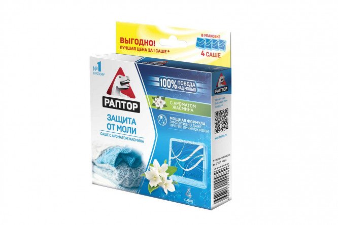 Harmless at first glance, moths are very voracious and can cause irreparable damage to your favorite things. The package of Raptor brand products against moths and their larvae contains 4 sachets with the aroma of jasmine. Each bag has a sticky layer. The active component is transfluthrin, a modern substance of the pyrethroid group that is effective against insects.
