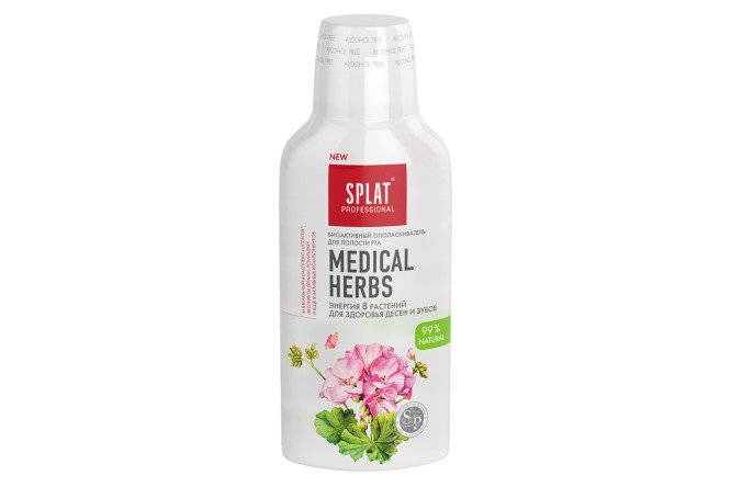 SPLAT Professional MEDICAL HERBS mouthwash supports healthy teeth and gums. The unique patented complex BIO Sp.White® Mouthwash from the bromelain enzyme and bifidobacteria lysates brightens the enamel and supports local immunity. The unique LUCTATOL® complex reduces the risk of caries formation and prevents the appearance of plaque by 96%. The essential oil of geranium in the composition is known as a powerful natural antiseptic. Active extracts of sea buckthorn, hawthorn, chamomile and sage have an anti-inflammatory effect and prevent gum bleeding. Clinically proven effectiveness after 4 weeks of use.