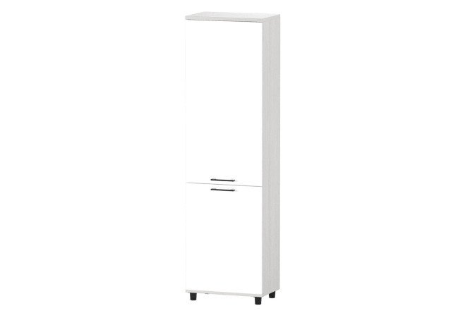 The multi-purpose wardrobe from the Grace collection is a convenient pencil case for storing linen, knitted and knitted clothes, table textiles, boxes with accessories or toys. The model with shelves behind hinged doors is made in a laconic style, so it will be an excellent solution for any modern interior, especially in combination with other Grace furniture. The product looks very elegant thanks to the elegant combination of shades and textures: the snow ash body and matte fronts with large contrasting handles.