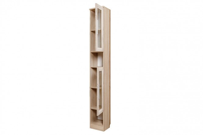 The narrow Sherwood cabinet-rack, divided into six sections, can be used to store books, discs, beautiful dishes or a collection of souvenirs. Thanks to the absence of legs, the cabinet has additional stability. This compact pencil case, made of durable laminated chipboard in a fashionable Sonoma oak effect, requires very little space, but is quite roomy. The storage space is divided into zones, two sections are open, the rest are closed with glass doors, which will protect the contents of the compartments from dust. The glass on the doors is decorated, and another decoration of the rack are stylish metal handles.
